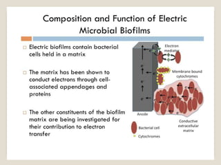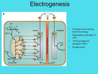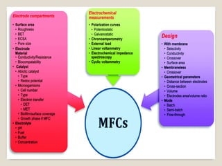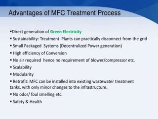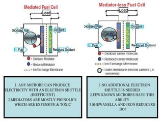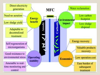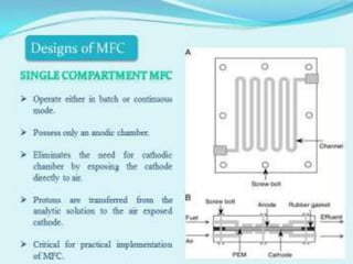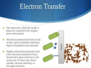 1) A microbial fuel cell (MFC) uses microorganisms to convert chemical energy to electrical energy. MFCs contain an anode and cathode separated by a membrane, and electrons produced during microbial oxidation are transferred to the anode.