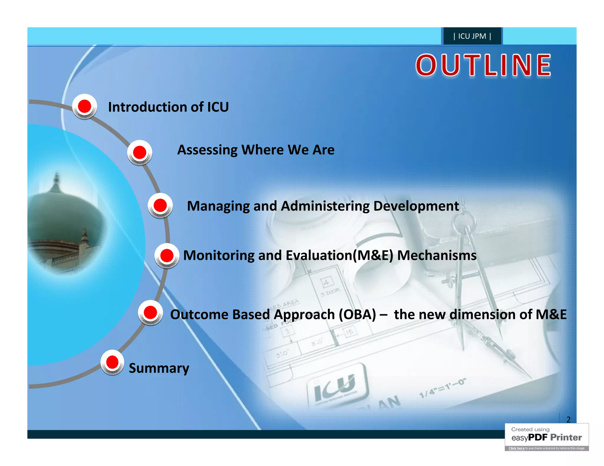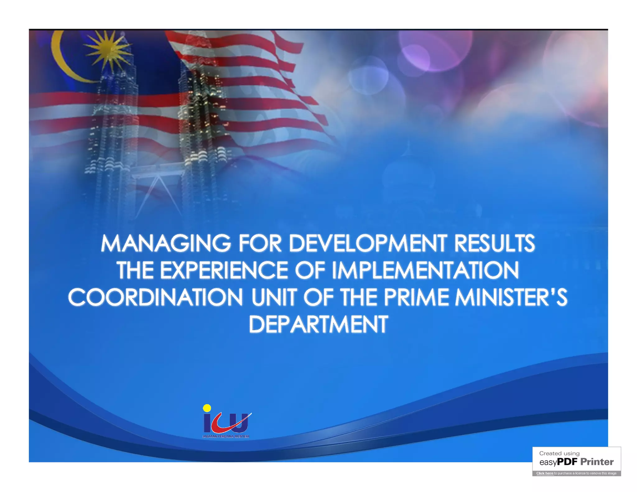 The document discusses monitoring and evaluation mechanisms for development projects in Malaysia. It introduces the Implementation Coordination Unit (ICU) and its role in managing and monitoring development projects. It outlines ICU's monitoring initiatives and machinery, including its project monitoring system called SPP II. The document emphasizes the importance of outcome-based approaches and monitoring outcomes rather than just outputs to evaluate effectiveness. It also discusses challenges with current monitoring practices and the need to transform to more results-based frameworks.