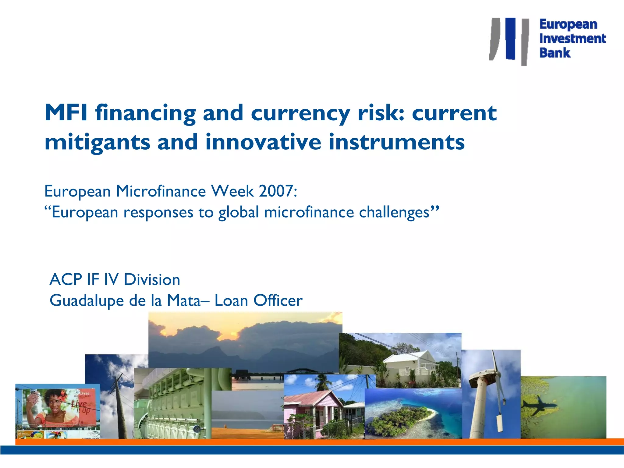 This document discusses mechanisms to mitigate foreign exchange and currency risk for microfinance institutions (MFIs). It outlines traditional options used by donors and MFIs, such as lending in local currency, matching foreign currency liabilities to assets, and creating foreign currency reserves. It also explores other options like improving MFI access to local financial and capital markets through loan guarantees and bond guarantees. Finally, it discusses tapping international capital markets through private equity funds that invest in MFIs in local currency, and microfinance debt funds that provide loans to MFIs across currencies to diversify risk.