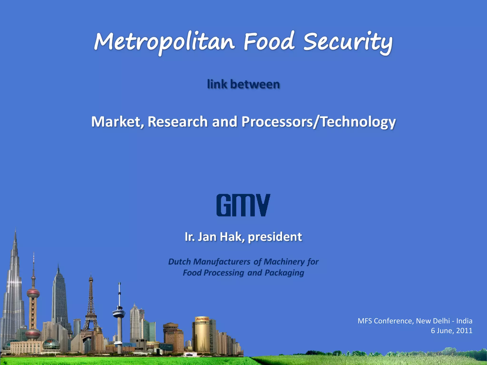 The document outlines the agenda for the MFS Conference in New Delhi, India, which will cover introductions, performances in food processing technology and products, ambitions with a market-led approach, and innovations in cooperation, research, and education. Key topics that will be discussed include the Netherlands as a leader in the global agri-food industry, world-class performance initiatives, challenges and opportunities in the Indian food system, and a vision for long-term metropolitan food security in India through sustainable and innovative food production.