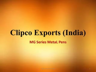 Clipco Exports (India) produces several metal pen models with various refill types and finishes. The document lists 6 pen models, including the MG 4 Diamond pen with a cross refill and gold plated parts, the MG 315 Silver Diamond Ball pen with a jotter refill and silver plating, and the MG 4 430 Silver Plated BallPen with a cross refill and gold plated parts. It also provides Clipco Exports' address, telephone, fax, email, and website contact information.
