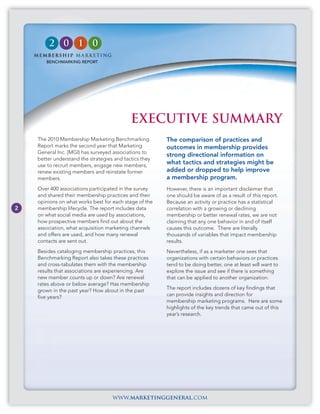 This document provides a summary of key findings from the 2010 Membership Marketing Benchmarking Report. The report surveyed over 400 associations about their membership practices and strategies. Some key findings include: