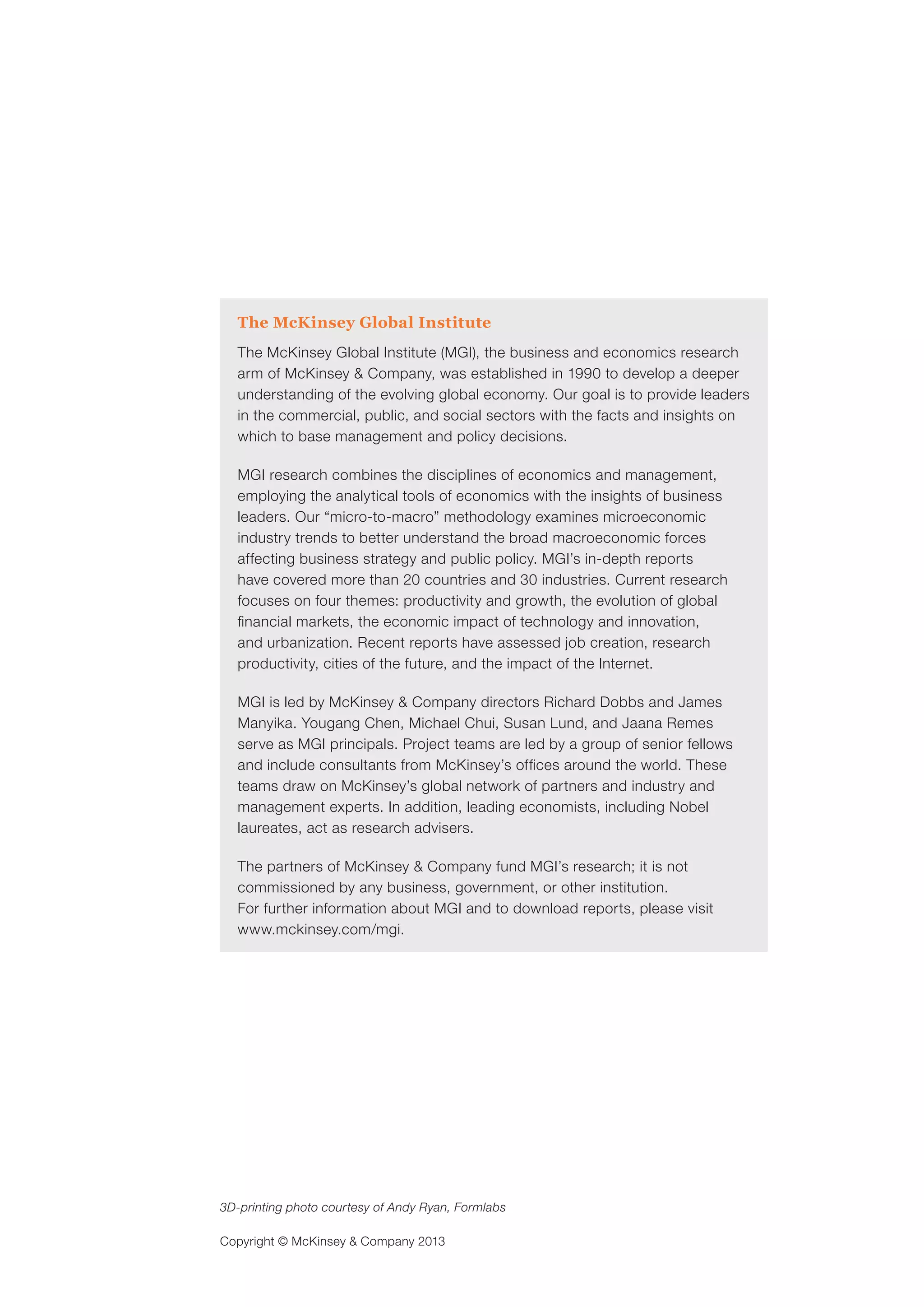 This document provides an overview and summary of disruptive technologies that could transform life, business, and the global economy by 2025 according to a report by the McKinsey Global Institute. It identifies 12 technologies with massive potential impact: mobile internet, automation of knowledge work, internet of things, cloud technology, advanced robotics, autonomous vehicles, next-generation genomics, energy storage, 3D printing, advanced materials, advanced oil and gas exploration/recovery, and renewable energy. The combined economic impact of applications of these 12 technologies may reach tens of trillions of dollars per year by 2025. These technologies will disrupt established norms and business models and present broad societal challenges and opportunities for growth.