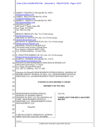 This document is a complaint for declaratory relief filed by MGM Resorts International and related entities (MGM Parties) regarding lawsuits and threatened lawsuits against them related to the October 1, 2017 mass shooting at a music festival in Las Vegas, Nevada by Stephen Paddock. The complaint argues that under the Support Anti-Terrorism by Fostering Effective Technologies Act of 2002 (SAFETY Act), federal courts have exclusive jurisdiction over such claims since security services at the event provided by Contemporary Services Corporation were certified by the Department of Homeland Security under the SAFETY Act. The complaint seeks a declaration that the SAFETY Act governs all actions and claims related to Paddock's attack.