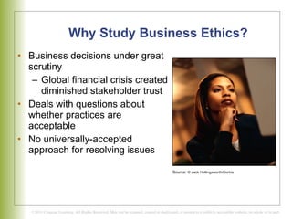 The document discusses the importance of business ethics. It notes that society's trust in businesses has declined in recent years due to several high-profile ethical issues. Studying business ethics helps identify ethical issues and maintain trust with key stakeholders. The timeline shows how business ethics emerged as a field from the 1960s onward in response to social issues and demands for more ethical practices from consumers, employees, and other groups. Maintaining strong ethical culture and compliance programs can contribute to employee commitment, investor loyalty, customer satisfaction, and ultimately profits.