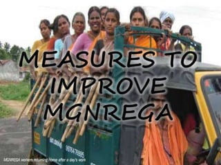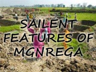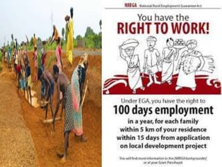 The document discusses India's Mahatma Gandhi National Rural Employment Guarantee Act (MGNREGA). Key points:
