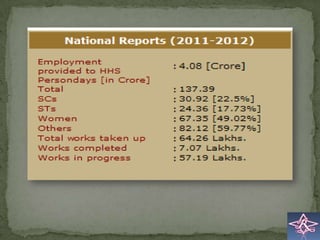 The Mahatma Gandhi National Rural Employment Guarantee Act (MGNREGA) is an Indian job guarantee scheme that provides at least 100 days of employment per year doing unskilled manual labor at minimum wage to members of rural households willing to do public work. The Central government allocates 40,000 crore (US$8.8 billion) annually for the program. It aims to achieve rural development and employment generation through activities like water conservation, afforestation, rural connectivity projects, and flood control works.
