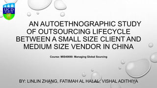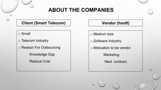 This document presents an autoethnographic study of the outsourcing lifecycle between a small client, Smart Telecom, and a medium-sized vendor, Hsoft, focusing on a smart building software project. It explores the client-vendor relationship, the significance of knowledge gaps, cost reduction motivations, and the detailed processes involved in vendor selection and project management. The methodology emphasizes personal reflection and self-observation throughout the outsourcing stages, from investigation to project completion.