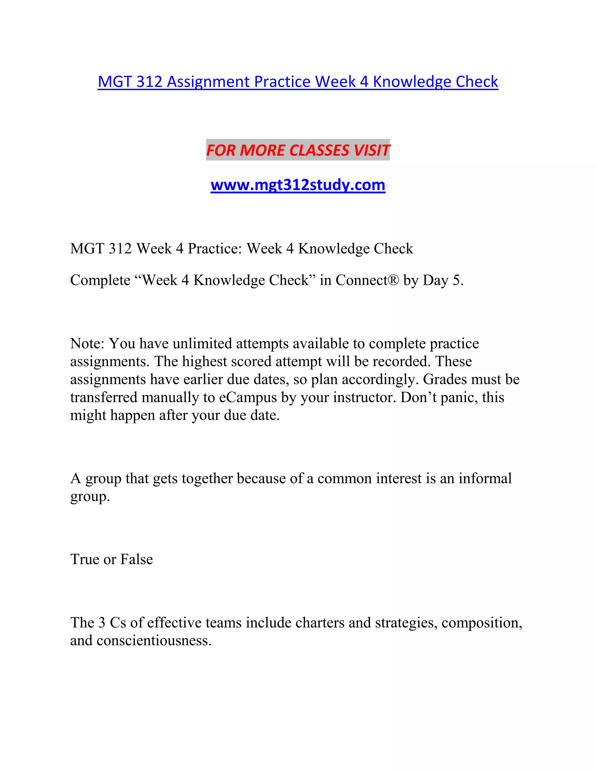This document provides information and instructions for students taking MGT 312, including assignment details and due dates. It announces practice knowledge checks and assignments related to topics like teams, motivation, perceptions, and socialization. Students are instructed to complete assignments in Connect and notes that grades will be manually transferred to the course site. The document also provides links to additional class resources and materials.