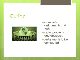 The Lean Green Clean Up Team has completed several initial tasks including meeting with Operation Clean Sweep, developing a lesson plan, and obtaining sponsorship funds. Major obstacles include scheduling issues with the elementary school and delays in clearances. Remaining tasks are to finalize lesson plans, create a float, obtain community partner assistance, assess project impact, host a clean up event, and acquire additional sponsors.