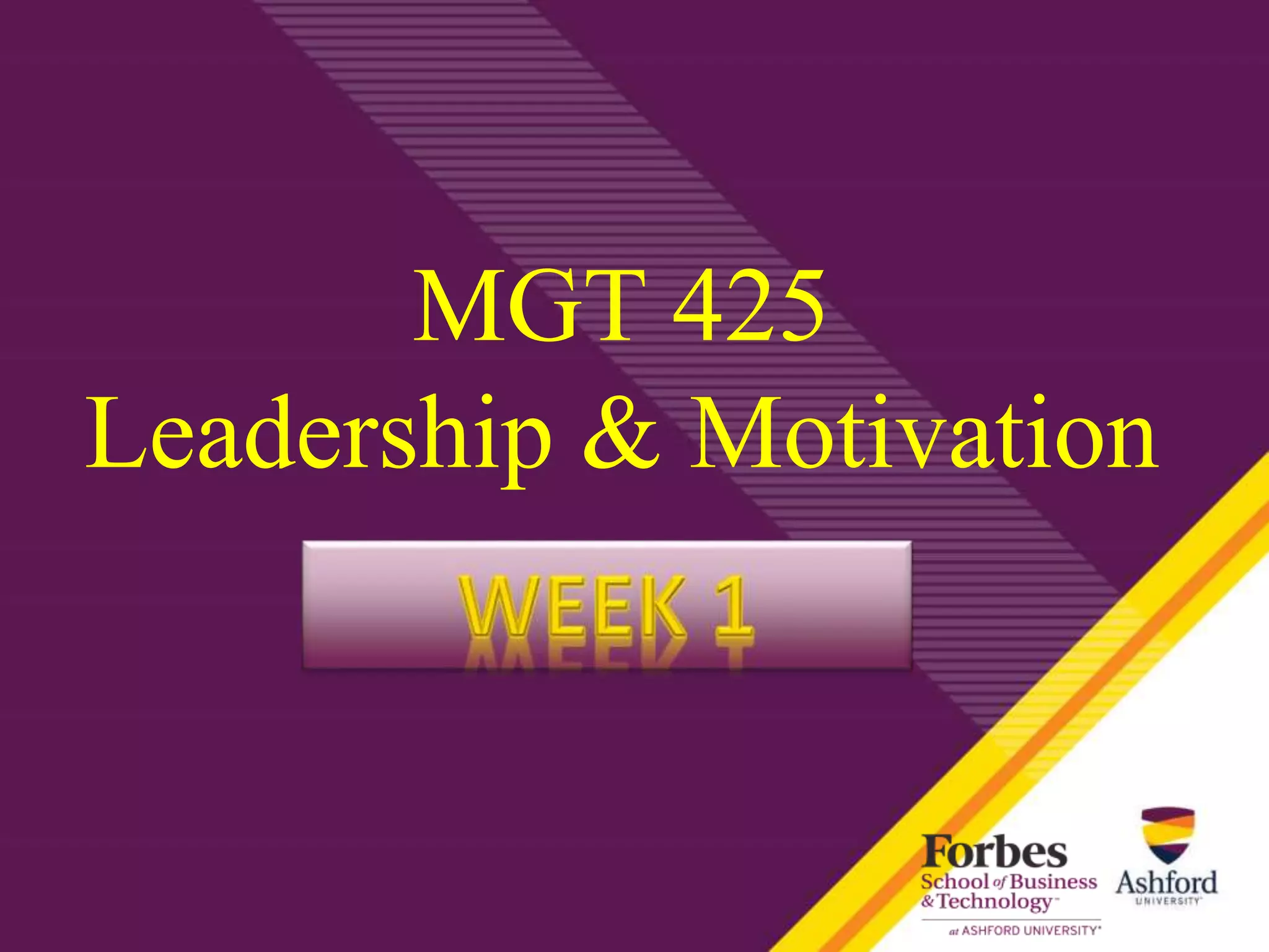 This document provides an overview of the requirements and materials for Week 1 of an online class called MGT 425: Leadership & Motivation. Students are expected to read chapters 1-4 of the required textbook on motivation and leadership. They must post an introduction, respond to two discussion questions by Thursday and Monday respectively, and complete an assignment on personal motivation due Monday. The class will cover evaluating individual motivation sources and applying motivation theories to workplaces.