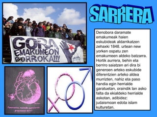 SARRERA Denobora daramateemakumeak haien eskubideak aldarrikatzen zehaxki 1848. urtean new yorken ospatu zen emakumeen aldeko batzarra. Hortik aurrera, behin eta berriro saiatzen ari dira bi generoen arteko eskubide diferentzien arteko aldea murrizten, nahiz eta paso handia egin herrialde garatuetan, oraindik lan asko falta da ekialdeko herrialde askotan, adibidez: judaismoan edota islam kulturetan.
