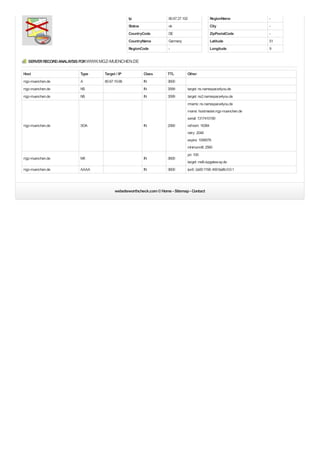 This document provides information about the website mgz-muenchen.de. It has an Alexa rank of over 7 million and gets approximately 0 daily visits. The website is hosted on the same server network as several other low traffic sites. The name servers and DNS records for the domain are also listed.