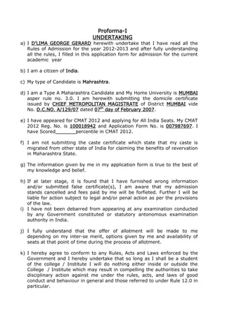 D'Lima George Gerard submits this undertaking for admission to the 2012-2013 academic year. He is an Indian citizen from Maharashtra seeking admission under the Maharashtra domicile rules. He appeared for the CMAT 2012 exam and received a percentile score. He affirms that the information provided is true and understands the consequences of submitting false information. He agrees to abide by the rules and regulations of the institution he is admitted to.