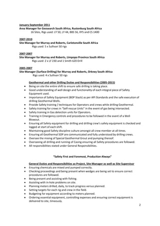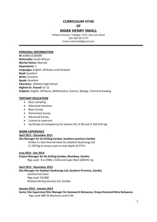 The document is a curriculum vitae for Mark Henry Small. It details his personal information, education history, tertiary education, work experience including various site manager and project manager roles over 15 years drilling geothermal and other holes across Africa, skills and attributes, and references. His work experience includes drilling geothermal holes in Zambia to depths over 500 meters and ensuring safety practices.