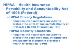 The document provides an overview of HIPAA regulations regarding the privacy and security of protected health information (PHI) and electronic protected health information (e-PHI), emphasizing that healthcare workers should only access the patient information necessary to provide care, maintain privacy and security of accessed information, and report any potential privacy violations. It also discusses the ethical responsibility of healthcare workers to properly manage and protect sensitive patient data.