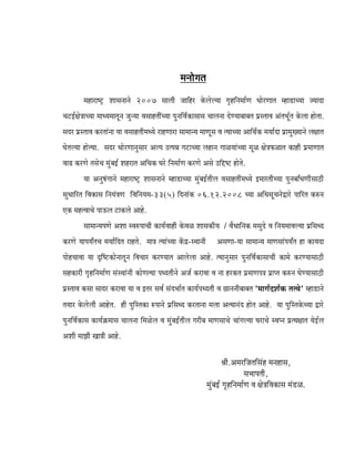 1. The Maharashtra Housing and Area Development Authority (MHADA) issued a Government Resolution on December 6, 2008 regarding the implementation of the Slum Rehabilitation Scheme across Mumbai.