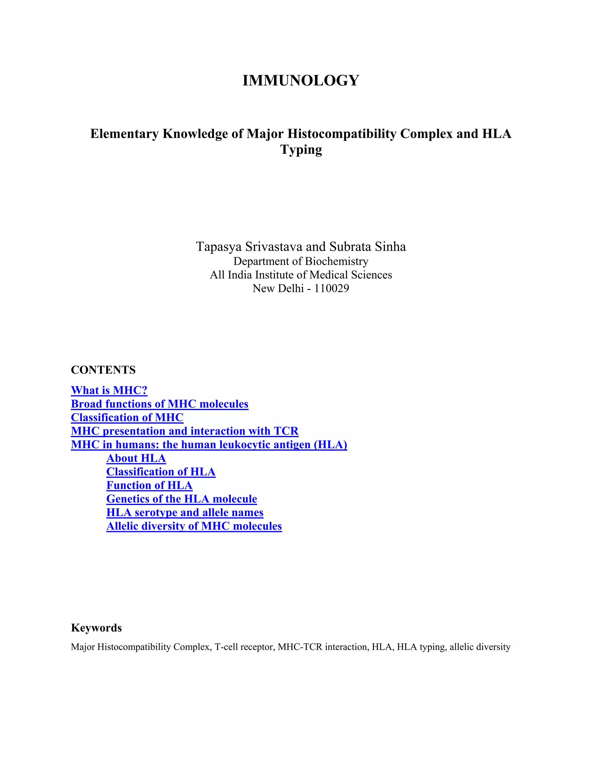 The document provides an overview of major histocompatibility complex (MHC) and human leukocyte antigen (HLA) typing. It discusses that MHC molecules present antigen fragments to T cells and are classified into classes I, II, and III. MHC proteins in humans are called HLA genes and are located on chromosome 6. The document describes HLA classification, functions in infectious disease, graft rejection, and autoimmunity, as well as genetics and methods of HLA typing including serotyping, phenotyping, and allele names.