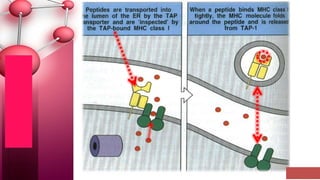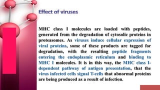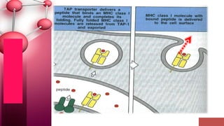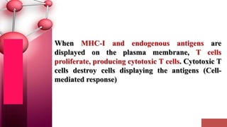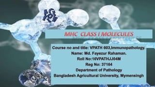 Major histocompatibility complex (MHC) class I molecules are crucial for immune response, presenting peptide fragments of non-self proteins to cytotoxic T cells. They consist of an α-chain and β2-microglobulin, with recognition requiring cell contact and specific peptide-MHC association. If the MHC I molecules are absent, natural killer (NK) cells respond to potentially infected cells, indicating their role in cellular immunity.