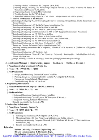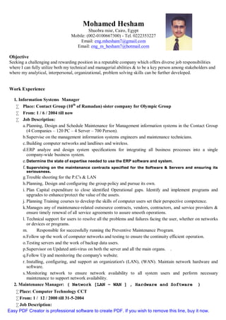Mohamed Hesham is an experienced IT professional seeking a challenging position utilizing his technical and managerial skills. He has over 15 years of experience in roles such as Information Systems Manager, Maintenance Manager, and Engineering Maintenance. His experience includes planning, designing, and maintaining computer networks, servers, databases, and business systems for various companies. He is Microsoft and Oracle certified with expertise in areas such as database administration, ERP systems, and project management.