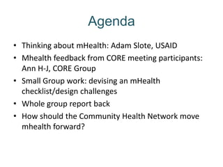 The document outlines a community health and mHealth agenda, focusing on challenges and solutions across various health domains, including tuberculosis, HIV, and nutrition. It emphasizes the need for targeted interventions to improve community-based health services through technology, such as text messaging and data monitoring. A checklist is suggested for designing mHealth applications, encouraging creative and realistic assessment of their potential impact in specific settings.