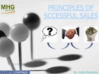 The document provides an overview of principles for successful sales. It discusses 17 topics including personal aims, the sales process, defining success, basic rules, closing techniques, common mistakes, and leadership. The overall message is that successful selling requires understanding customer needs, having a positive attitude, strong communication skills, and perseverance. Prospects are more likely to buy when their problems and questions are addressed through an ethical, solutions-oriented process.
