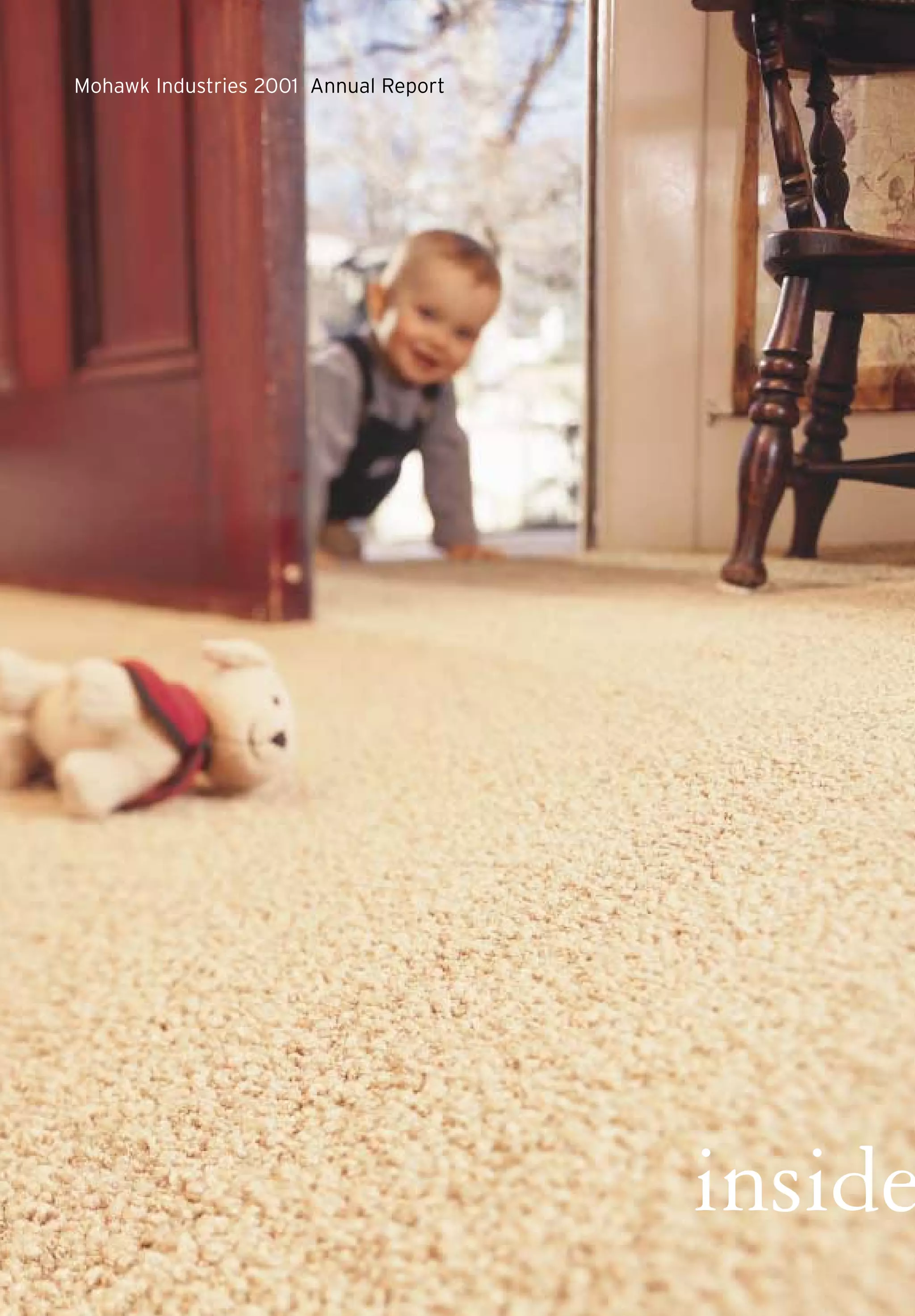 This document is Mohawk Industries' 2001 Annual Report. The summary provides: 1) Mohawk achieved record financial results in 2001 despite economic challenges, with net earnings of $188.6 million and diluted EPS of $3.55, up 15% from 2000. 2) Mohawk continued improving operations through cost reductions, debt paydown, inventory management and cash flow increases. 3) Mohawk completed a merger with Dal-Tile to become a leader in both soft and hard flooring, with the goal of expanding product categories and driving shareholder value.