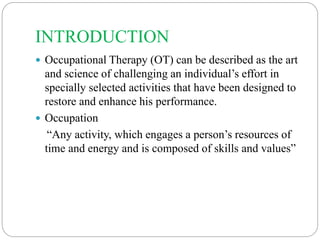 Occupational therapy involves using goal-oriented activities to treat psychological, physical, and developmental disabilities. It aims to promote recovery, mobilize patient assets, prevent hospitalization, and help patients regain self-confidence. Occupational therapists select activities based on a client's interests, abilities, and IQ to provide new experiences and a sense of accomplishment. Examples of activities include crafts, social skills training, and industrial work. The role of nurses is to coordinate occupational therapy with other professionals and provide support and encouragement to clients.