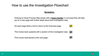 This document provides guidance on investigating out of specification or out of trend results from laboratory analyses. It describes a multi-step investigation process including: Phase Ia investigations to identify obvious errors; Phase Ib investigations conducted by an analyst and supervisor using a checklist to identify potential causes; Phase II investigations if no cause is found that may involve additional parties; and Phase III investigations and batch disposition if needed. Key terms related to investigations are also defined, such as out of specification, out of trend, assignable cause, and invalidated test.
