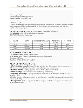 This document is a curriculum vitae for Jaipal Singh M, a Senior Engineer (Mechanical) at L&T. It outlines his contact information, objective, educational qualifications including a Bachelor's degree in Mechanical Engineering, over 7 years of work experience in mechanical engineering and project management roles at L&T, responsibilities including monitoring contractors, ensuring safety guidelines, and preparing project specifications. It also lists achievements like commissioning various material handling equipment and completing internship programs.