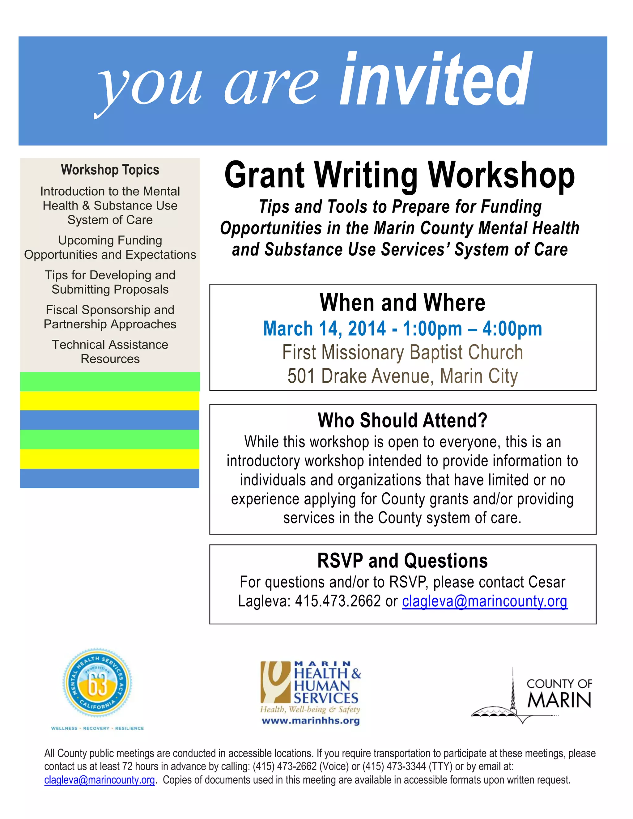 This document announces a grant writing workshop that will provide an introduction to Marin County's mental health and substance use system, upcoming funding opportunities, tips for developing and submitting proposals, approaches to fiscal sponsorship and partnerships, and information on technical assistance resources. The workshop is open to all but intended for those with limited experience applying for County grants or providing services in the system. Attendees should RSVP by contacting Cesar Lagleva by March 14th if they have any questions or need assistance with transportation.