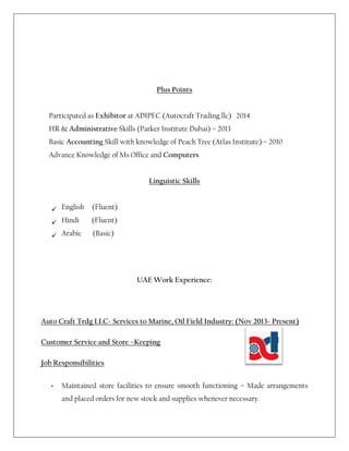 The document is a resume for Mohammed Hussein Kanuga, an Indian national living in the UAE with a UAE residence visa. It provides his personal details including name, nationality, date of birth and contact information. It then lists his qualifications including a BSc in Business Administration and an Advanced Diploma in Interior Designing. It also outlines his work experience in customer service and store keeping roles at Auto Craft Trading LLC, as a data entry operator and customer service executive at DU, and as a data entry operator at Mashreq Bank in Dubai.