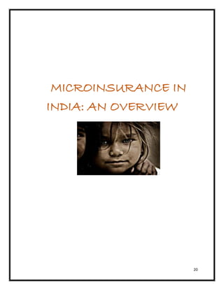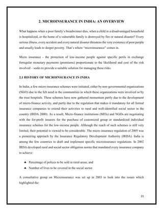 Microinsurance provides insurance protection to low-income individuals in India against risks such as death, illness, asset damage, and natural disasters. It began in India through non-profit organizations and hospitals but has expanded due to regulations requiring insurers to offer rural and social policies. While uptake is still limited, the potential market size is large as 90% of Indians lack insurance. Common microinsurance products in India include life, health, property, crop and disaster policies. These are offered through various models including partner-agent, full-service, provider-driven and community-based. Recently, IRDA proposed expanding microinsurance by allowing more agent types and diversifying products with savings and health features to better serve low-income communities.