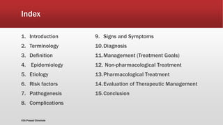 The document provides an extensive overview of myocardial infarction (MI) and acute coronary syndromes, detailing their definitions, causes, symptoms, epidemiology, risk factors, diagnosis, and management strategies. MI, commonly known as a heart attack, results from reduced blood flow to the heart, often triggered by plaque rupture in the coronary arteries, and is characterized by various symptoms including chest pain and shortness of breath. The document emphasizes the importance of early diagnosis and treatment to prevent complications such as heart failure, with management options comprising both pharmacological and non-pharmacological interventions.