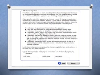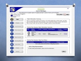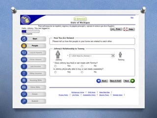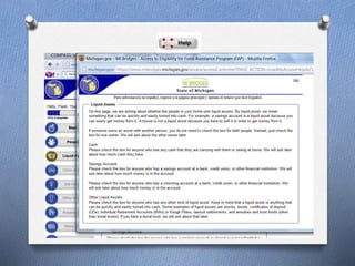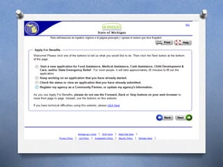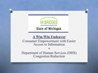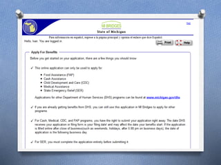 The document discusses MiBridges, an online portal for applying for and managing benefits from the Michigan Department of Human Services. MiBridges allows users to apply for benefits, check case status, recertify benefits, view correspondence, and check benefit balances online. The goals of MiBridges are to reduce office visits and phone calls to DHS, ease congestion, and empower users by providing easy access to benefit information. While MiBridges has benefits, some may still face barriers to using it such as lack of computer access, literacy, or knowledge that the online system exists.