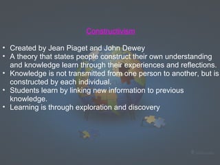 Constructivism is a theory of learning that states that individuals construct their own understanding and knowledge of the world through experiences and reflecting on those experiences. According to constructivism, learning is an active process where students learn by linking new information to previous knowledge and exploring ideas on their own. Key principles of constructivism include students learning through problem solving and incorporating new experiences into their existing understanding. In the classroom, constructivist teaching strategies include hands-on activities, collaborative learning, and using students' multiple intelligences. Constructivism aligns with critical thinking skills as defined in Bloom's Taxonomy, where students analyze, evaluate, and create new understanding.