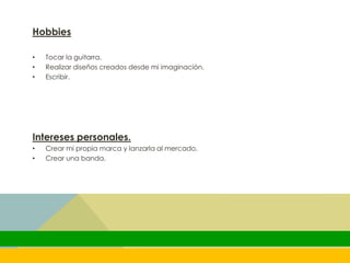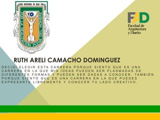 Ruth Areli Camacho Dominguez chose her career path because she feels her ideas can be expressed and shared in different forms through it. She also feels it is a career that allows her to freely express and explore her creative side. Her hobbies include playing guitar, designing using her imagination, and writing. Her personal interests are creating her own brand and launching it in the market as well as starting a band.