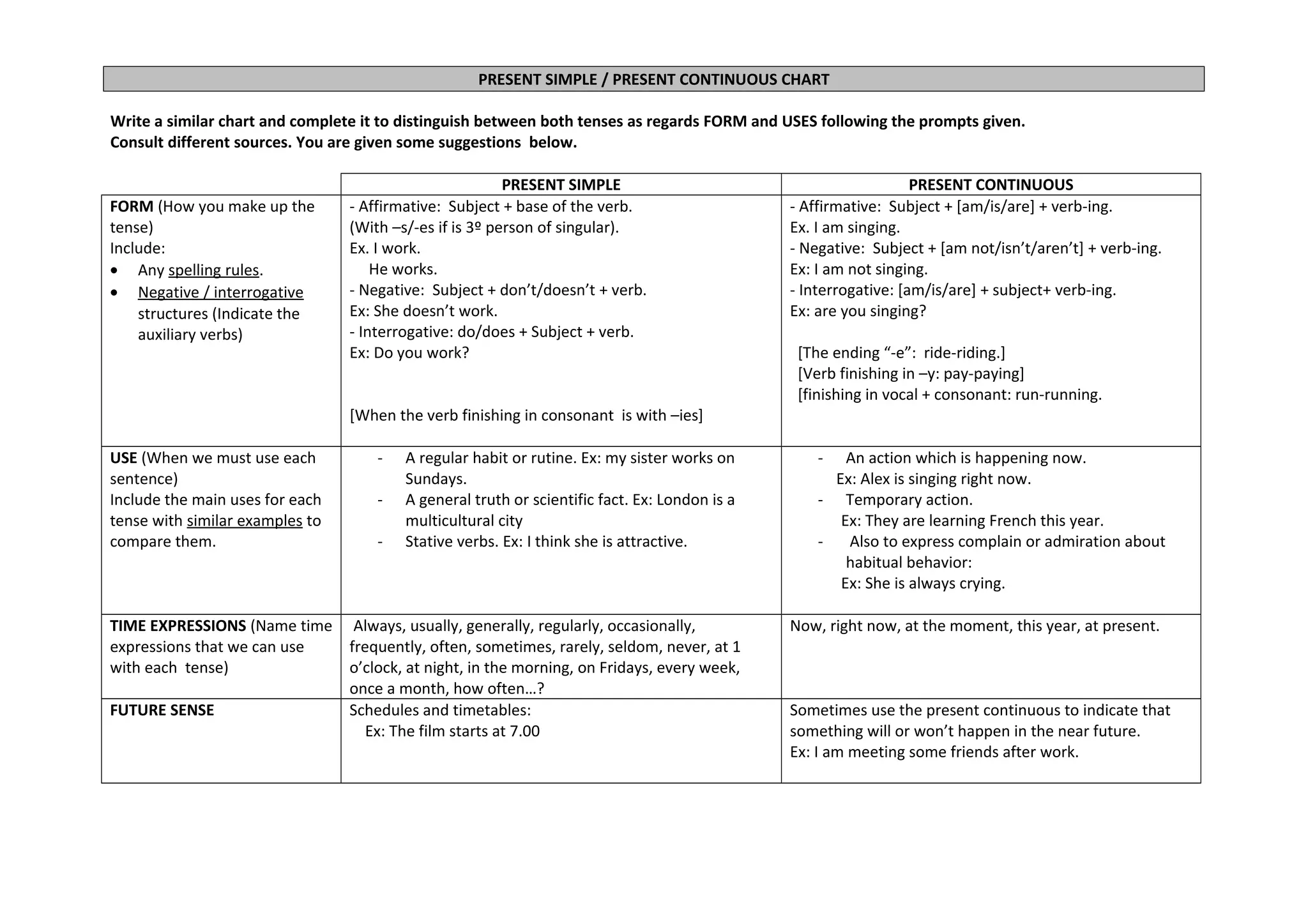 This document provides a template for a chart comparing the present simple and present continuous tenses in English. It includes prompts to fill in the form, uses, time expressions, and stative verbs for each tense. The form section addresses spelling rules and affirmative, negative, and interrogative structures. The uses section lists when each tense is used, such as for regular habits or ongoing actions. The time expressions section provides time words that can be used with each tense. The document also provides sources for additional information on stative verbs and examples of the tenses.