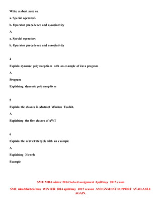The document provides information about assignment support for various programs, including MBA, BBA, BCA, and MCA for the winter 2014 and April/May 2015 exams. It outlines specific subjects and topics covered in the assignments, such as HTML document structure, Java packages, and the servlet lifecycle, with corresponding questions and explanations. The service is offered at affordable rates of Rs 600 per semester and Rs 110 per subject, with contact details provided for assistance.