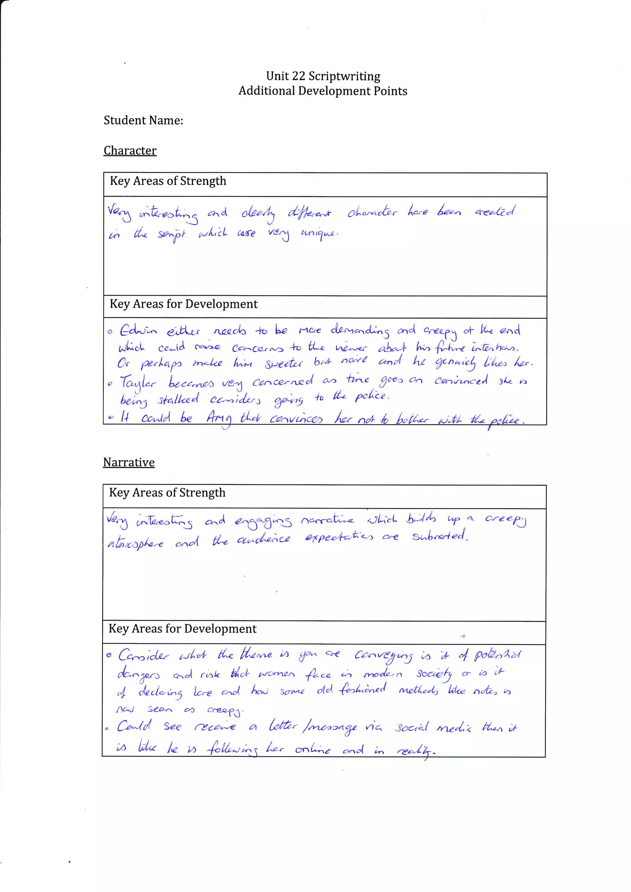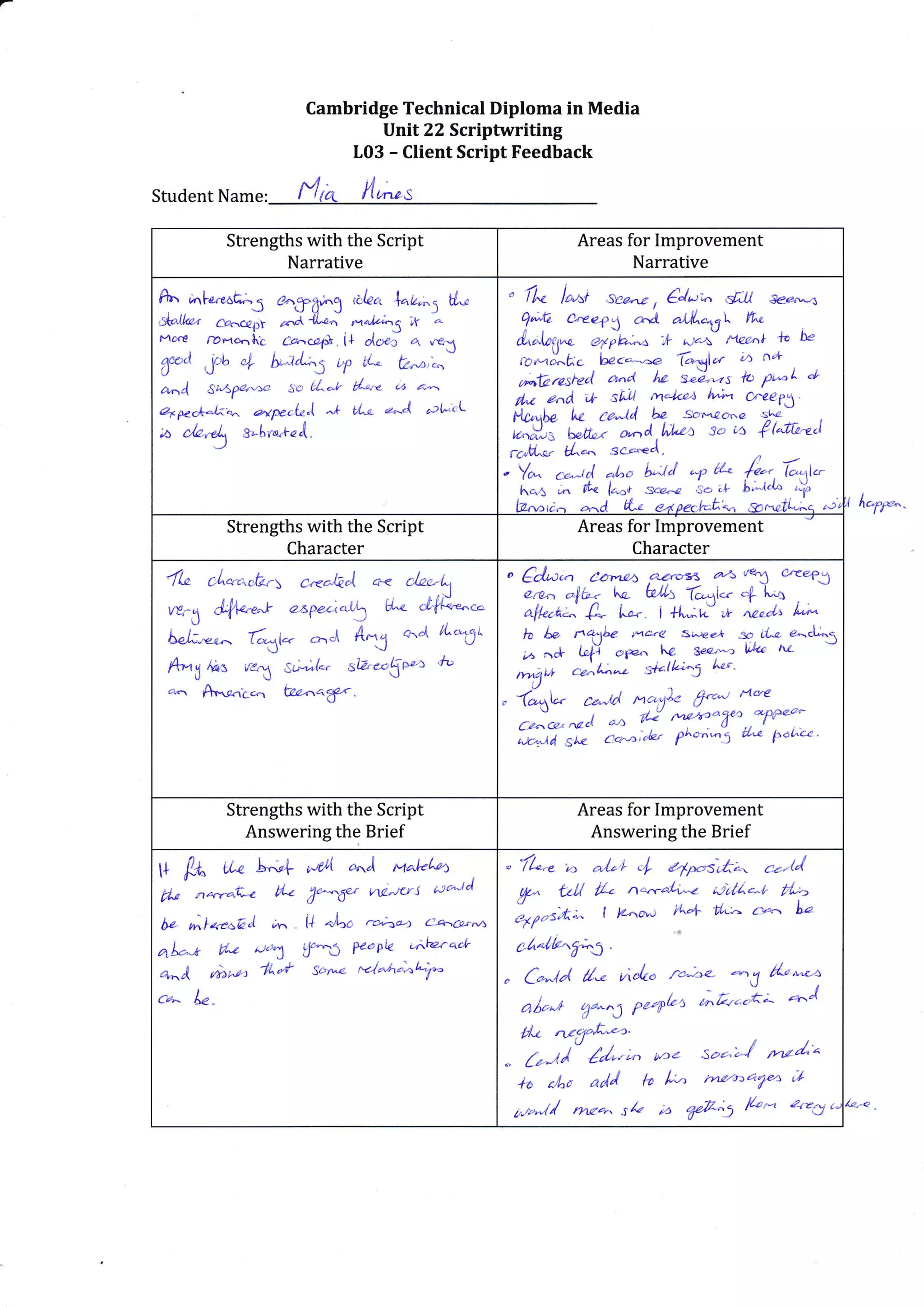 The script received positive feedback in key areas but also suggestions for improvement. Strengths included strong characterization and an engaging narrative. However, the character development could be expanded, and the story would benefit from more complex plotlines and subplots. Minor reworking was also recommended to better answer the brief and ensure the tone served the target audience. Overall the assessor saw potential but advised tightening certain elements to make the script more polished.