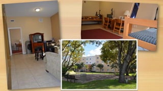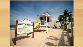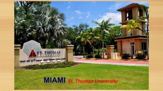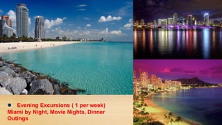 This document provides information about a study abroad program at St. Thomas University in Miami, Florida. The program offers accommodations on the university's tropical campus, weekly cleaning services, WiFi, and access to sports facilities. Students can participate in full or half day excursions to locations around Miami and Orlando one to three times per week. The document also mentions information about the nearby city of Fort Lauderdale and highlights that the language program is ACCET accredited and offers small group classes taught by native English speakers.
