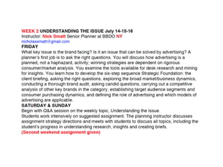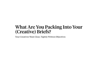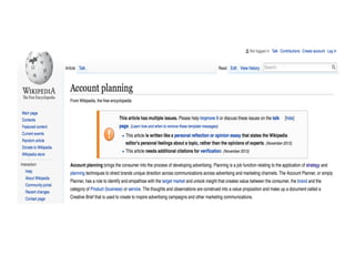 This document discusses the role of account planning in advertising, emphasizing the importance of truth and clarity in the creative brief process. It outlines the responsibilities of planners, the components of a successful brief, and various strategies for understanding client needs and market dynamics. Additionally, it highlights challenges in creating effective briefs and encourages an iterative approach to problem-solving in advertising.