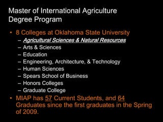 The document provides information about Oklahoma State University's Master of International Agriculture degree program. The 32-credit hour program can be completed in one year and includes courses in international agriculture, a focus area, and a required international experience or internship. Students choose from various focus areas and have the option to complete a thesis or creative component. The program prepares students for careers in areas like sustainability, disaster management, and agriculture around the world.