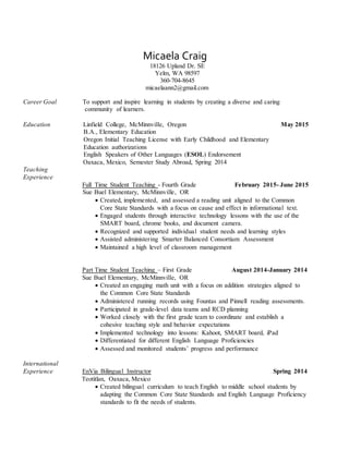 Micaela Craig is seeking a teaching position and has extensive experience working with students in various K-12 settings. She holds a Bachelor's degree in Elementary Education and has completed student teaching placements in 1st and 4th grades. Micaela has taught English in Mexico, tutored students in reading, and cared for children with special needs. She is bilingual in English and Spanish and skilled in incorporating technology into lessons.