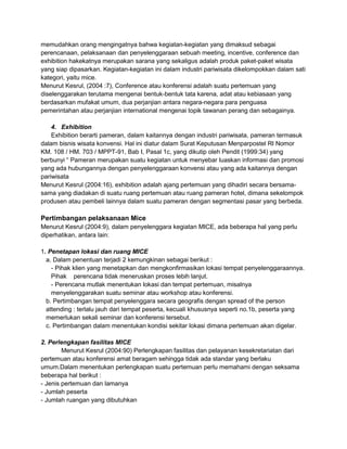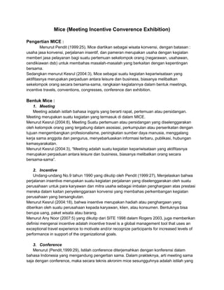 Dokumen tersebut membahas tentang MICE (Meeting, Incentive, Conference, Exhibition) yang merupakan kegiatan bisnis pariwisata yang melibatkan pertemuan kelompok orang untuk tujuan bisnis atau keilmuan. Dokumen tersebut menjelaskan pengertian, bentuk, pertimbangan pelaksanaan, dan tahapan menyelenggarakan event organizer dalam MICE.