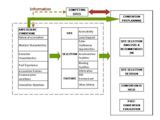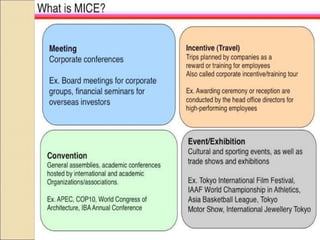 Meetings, incentives, conventions, and exhibitions (MICE) involve bringing together people for business or organizational purposes. The document outlines the various types of meetings and events, as well as the typical planning and logistical processes involved. It also discusses some top MICE destinations globally and within India, highlighting cities like Delhi, Mumbai, Chennai, and Hyderabad that have significant MICE infrastructure and facilities.