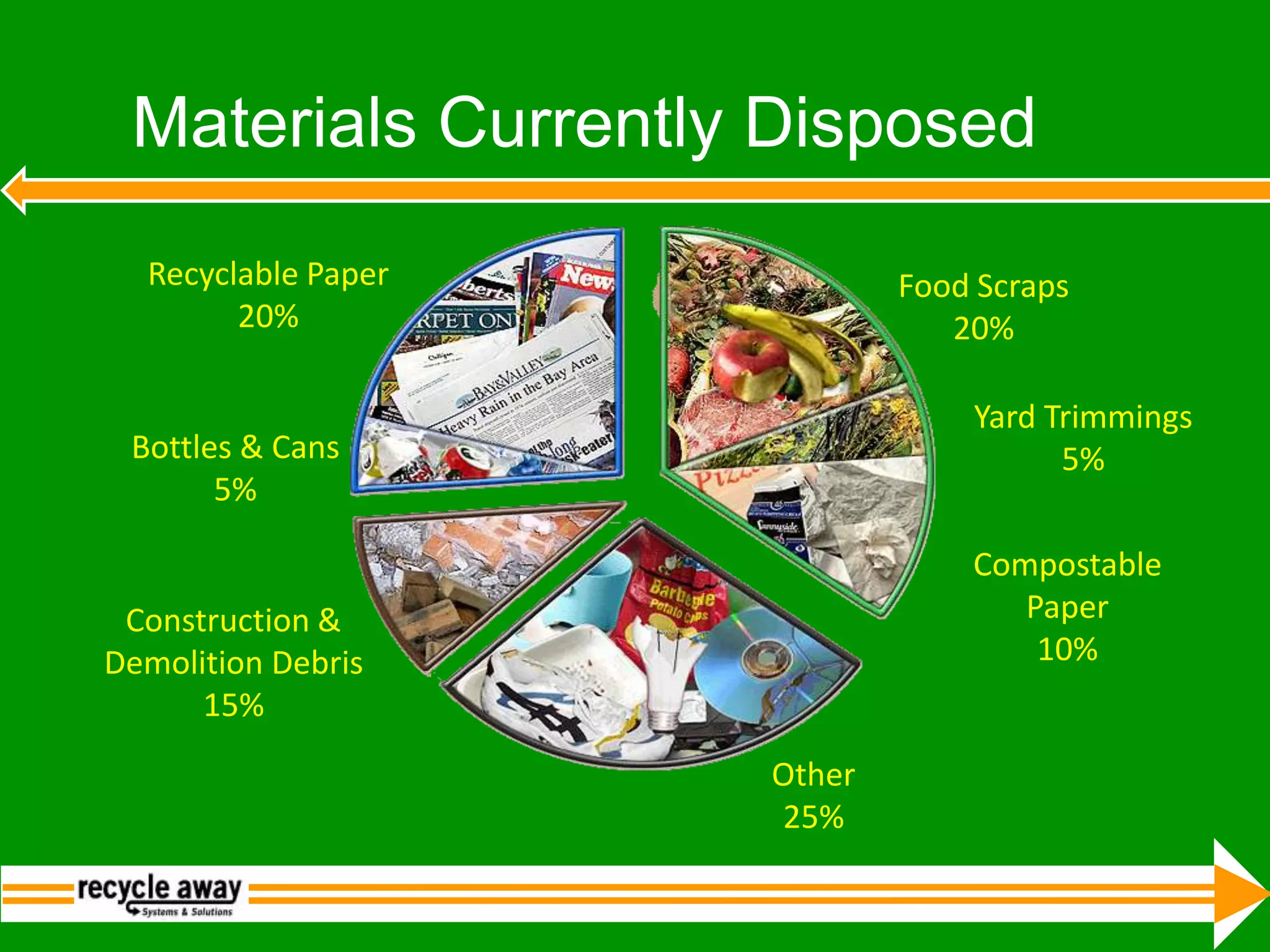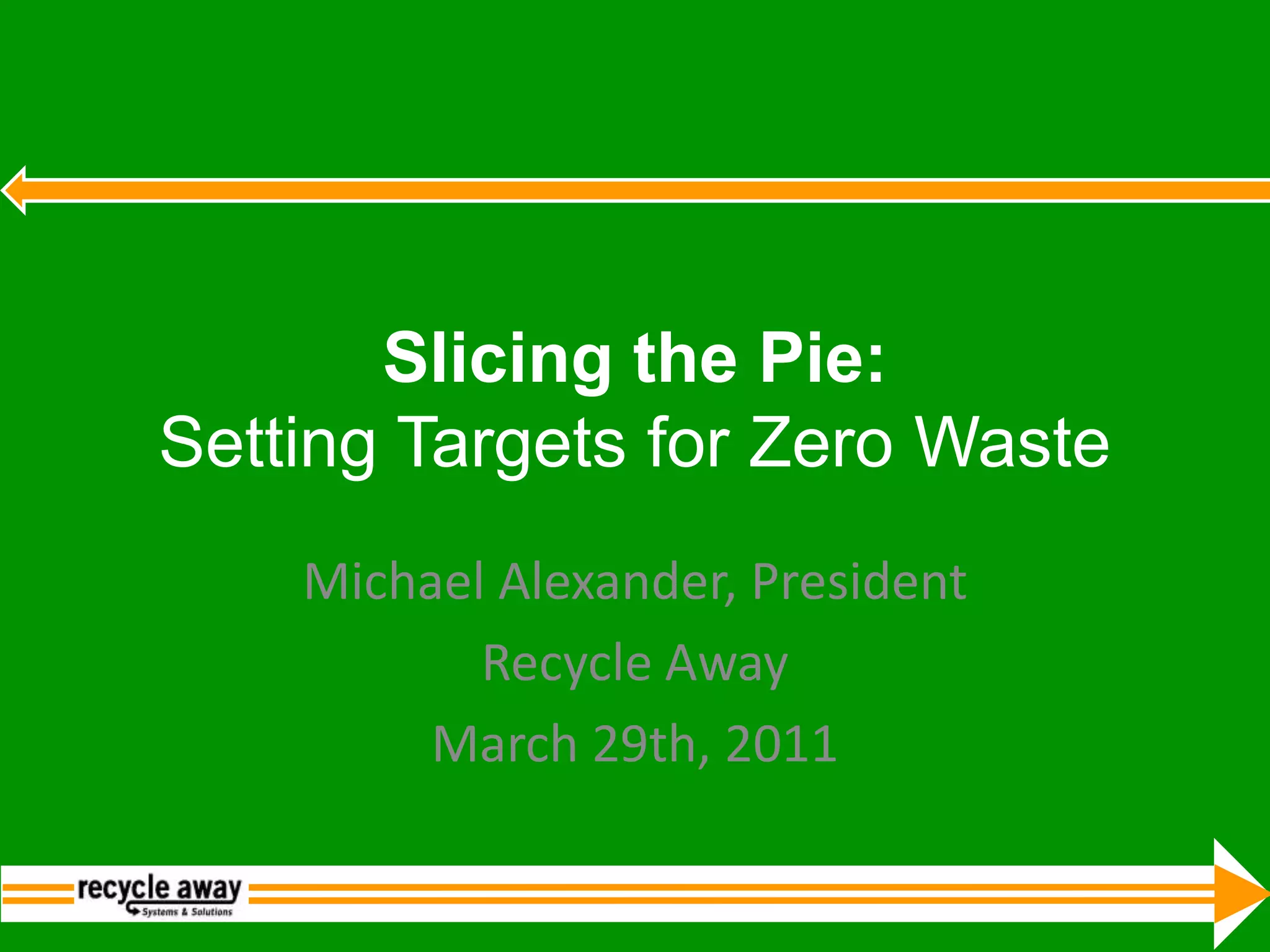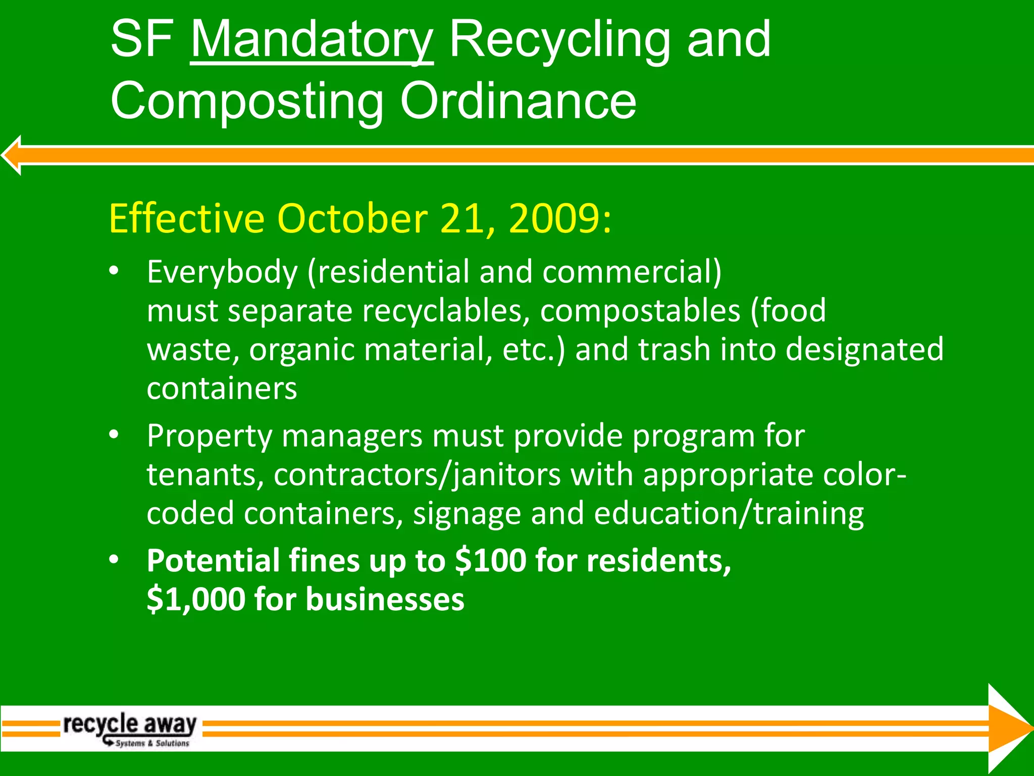 This document discusses strategies for achieving higher waste diversion rates. It provides data on the breakdown of materials currently disposed in landfills. Key strategies to reach 50% diversion include universal curbside recycling and composting, yard waste drop-off centers, pay-as-you-throw pricing, and construction and demolition debris recovery. Reaching 70% requires mandatory recycling and composting for all homes and businesses, and reducing trash pickup frequency. Nearly full diversion requires producer responsibility, developing markets for all materials, and education. San Francisco's program and ordinance are highlighted as a model, with over 72% diversion currently achieved.