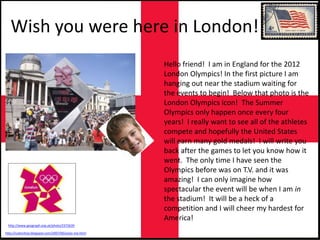 The document contains postcards from various locations around the world summarizing sights and activities. Locations include London for the 2012 Olympics, Honolulu, Hawaii, Istanbul, Turkey, Gallipoli, Turkey, Chichen Itza, Mexico, Puerto Vallarta, Mexico, the White House in Washington D.C., and Busch Gardens in Williamsburg, Virginia. The postcards encourage visiting these places and describe attractions like stadiums, beaches, historical sites, pyramids, mountains, presidential residences, and amusement parks.