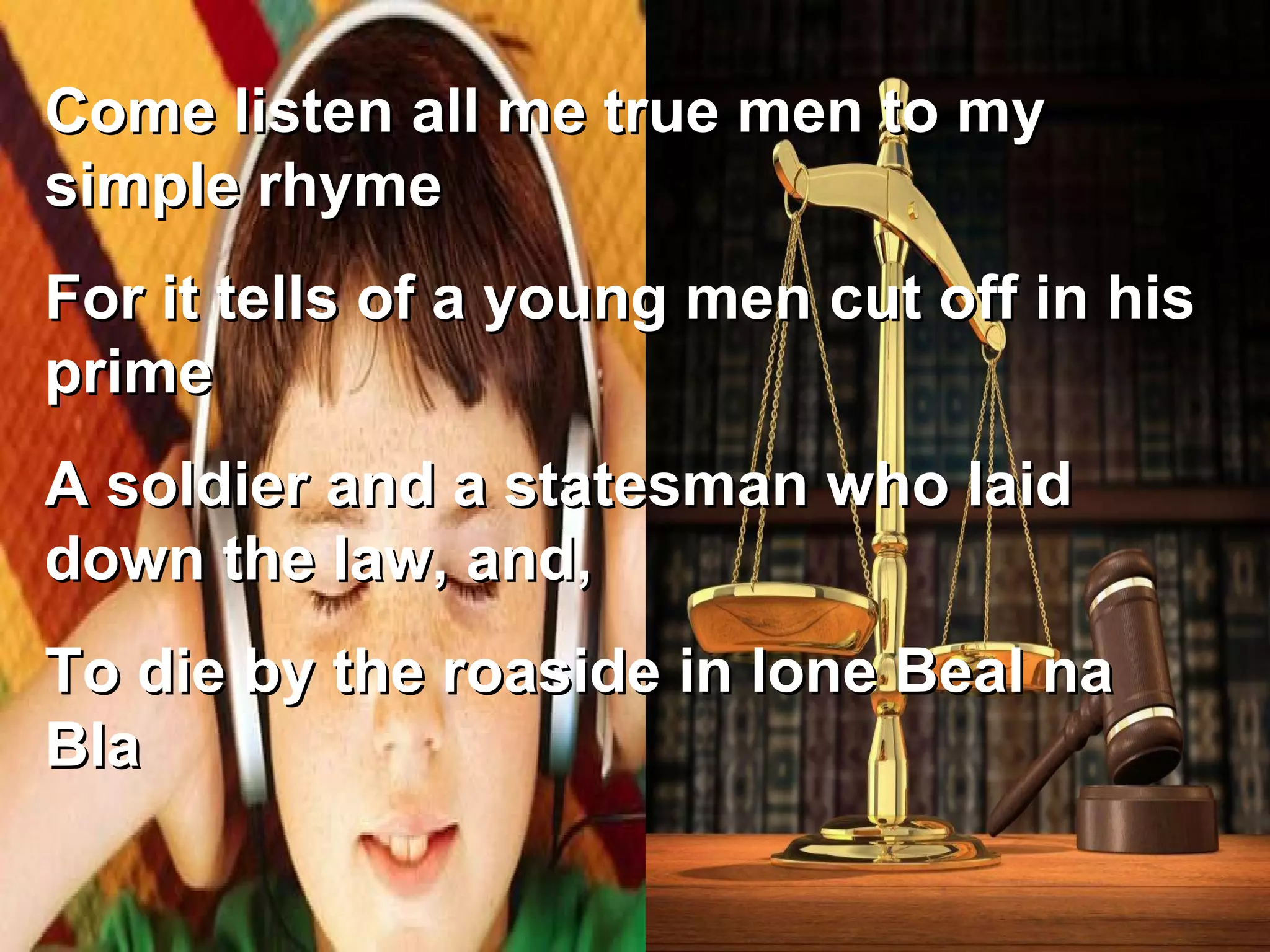 Michael Collins was an Irish soldier and statesman who fought for Irish independence. As a young man, he joined the Volunteers and fought in the Easter Rising of 1916. After being imprisoned, he helped organize more training for republican forces. As a leader of the Irish negotiations, he helped establish the Irish Free State but was assassinated in 1922 at the age of 31.