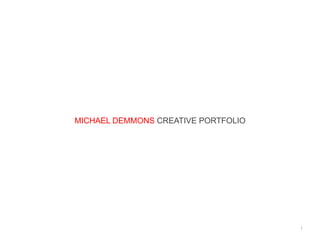 This document is a creative portfolio for Michael Demmons that includes samples of his work across various areas including website design, social media design and management, info graphics, brand development, graphic design, video and photography, advertising design, and project branding. The portfolio provides examples of Michael's work such as logo design, brochures, banners, signage, tradeshow booths, and videos to demonstrate his creative skills and experience.